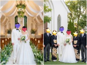 で、チャペル前に立っているお2人の写真